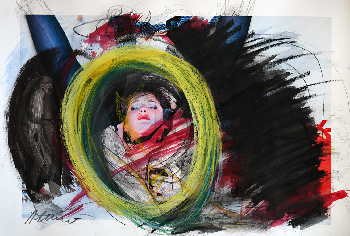 This work is from the 2013 Series “Unfinished into Death – Bondage”. The original photo was made by Rene Rietmeyer whereby Arnulf Rainer worked over his photo to “improve” it. Rene Rietmeyer and Arnulf Rainer worked together for over 4 years and created hundreds of works. The works that were made were often erotsch sexual or close to what some people would concider pornographic. The work was exhibited at the Venice Biennale.